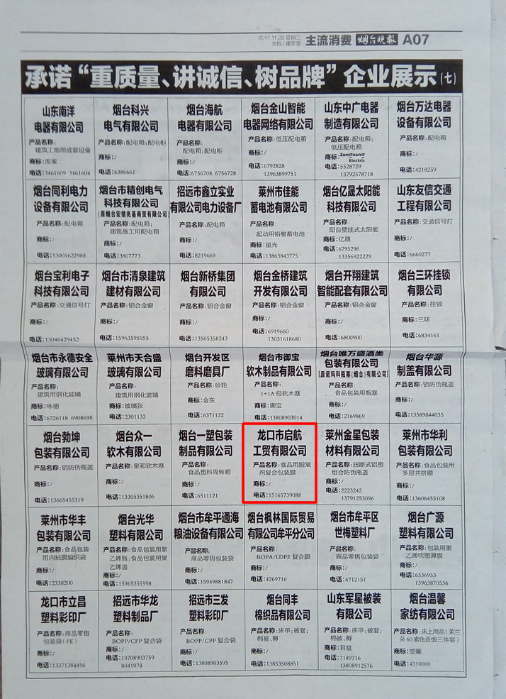 龍口市啟航工貿(mào)有限公司榮獲煙臺舉辦的承諾“重質(zhì)量、講誠信、樹品牌”企業(yè)。
